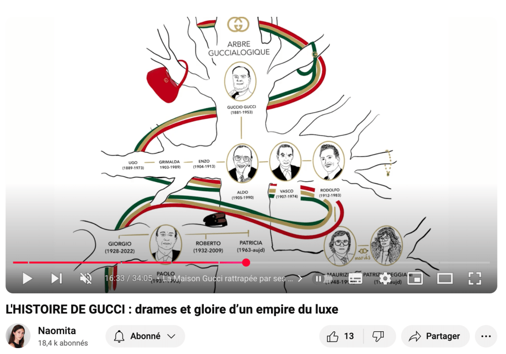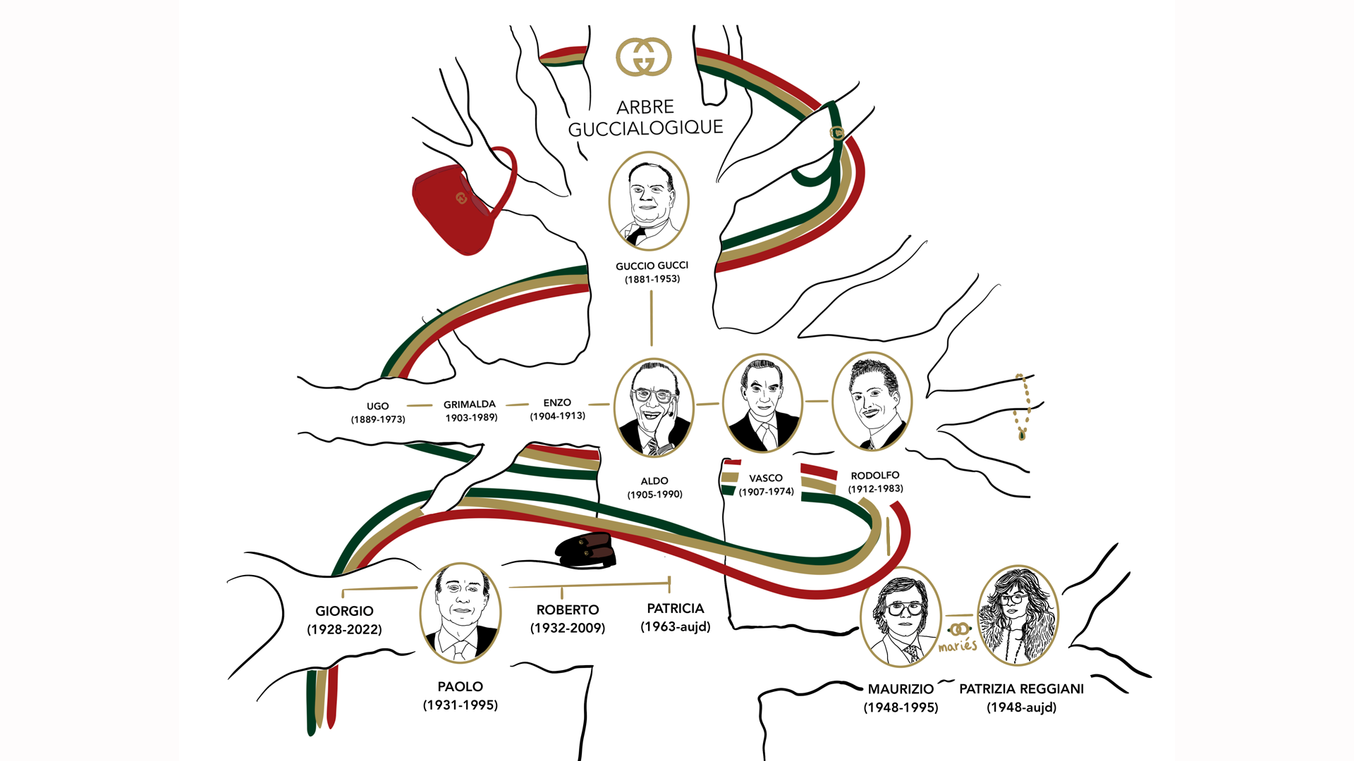 Illustration de l’arbre généalogique et des portraits de la famille Gucci pour la chaîne YouTube de Naomita « L’histoire de Gucci : drames et gloire d’un empire du luxe ».